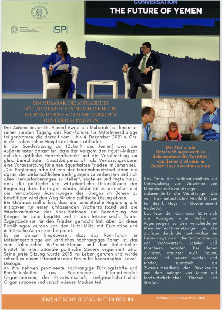In der Sondersitzung zur (Zukunft des Jemen) wies der Außenminister darauf hin, dass der Verzicht der Houthi-Milizen auf das göttliche Herrschaftsrecht und die Verpflichtung zur gleichberechtigten Staatsbürgerschaft als Verfassungsklausel eine Voraussetzung für einen dauerhaften Frieden im Jemen sei.